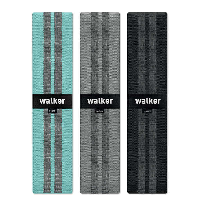 Set de 3 benzi de fitness din terilenă, bumbac și mătase latex într-o husă din RPET. Benzile de fitness au toate o rezistență diferită pentru un antrenament optim.